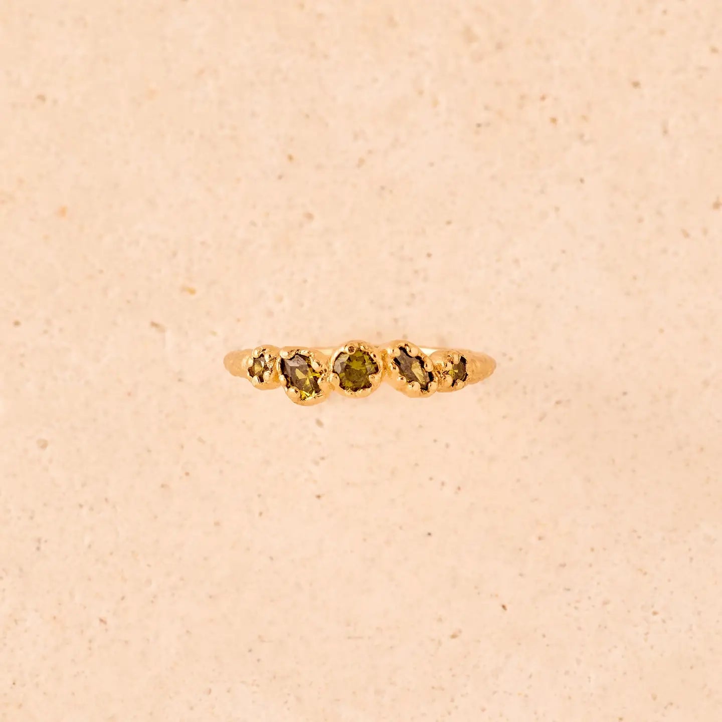 The Koré green slim cluster ring has five small dark green stones, each with natural variations in shade, organically and irregularly inlaid and handset in gold.