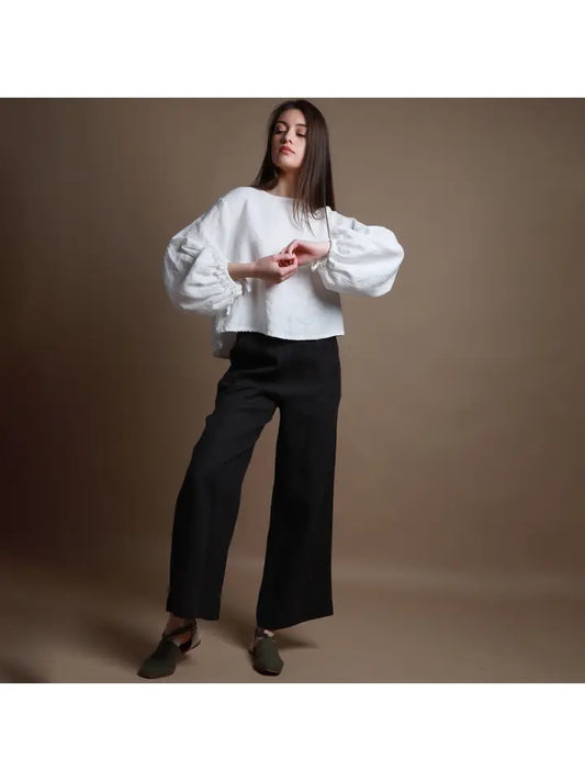 Puff Sleeve Cropped Linen Shirt with Back Ties Off White