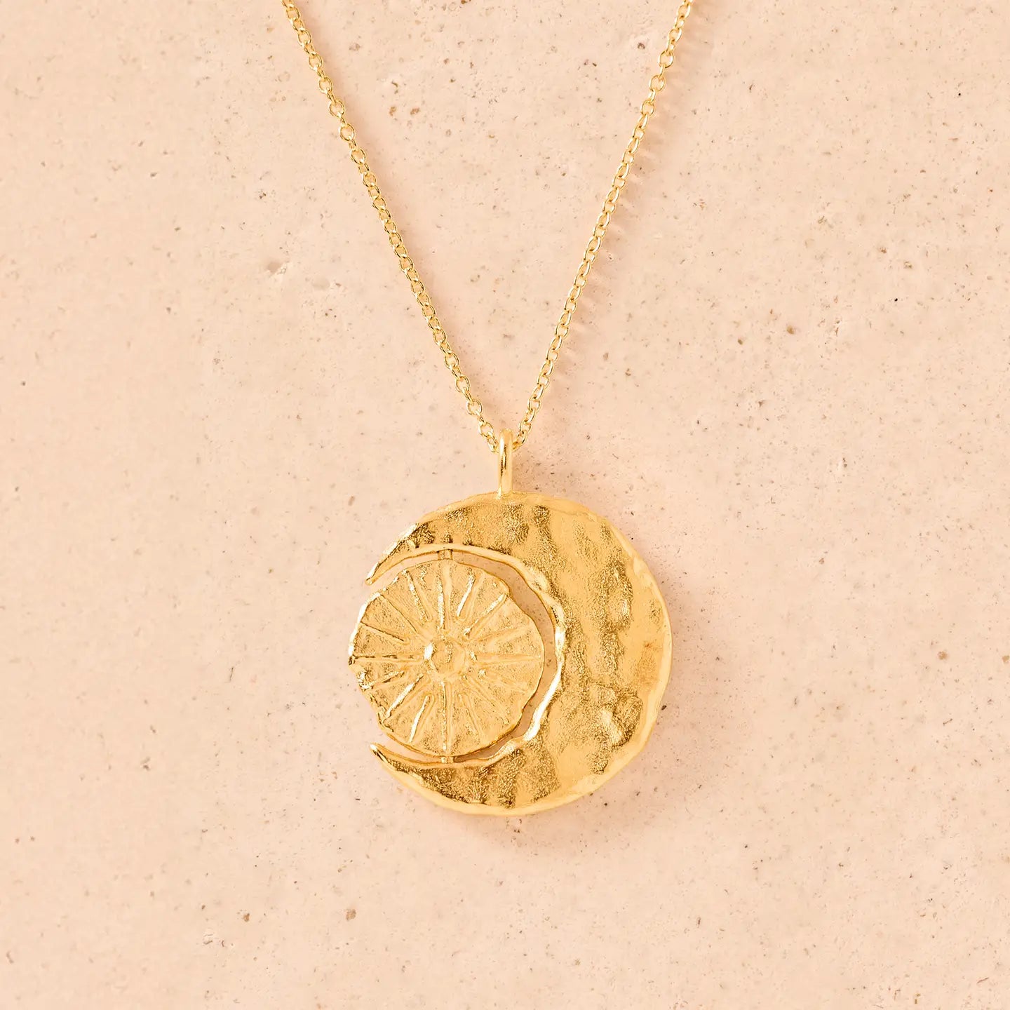 A crescent moon embraces a rotating sun, symbolizing the balance of divine forces and universal order. Wear Phébé to protect you, day and night. This necklace is part of our Kínisi collection, a series of moving and rotating jewelry.